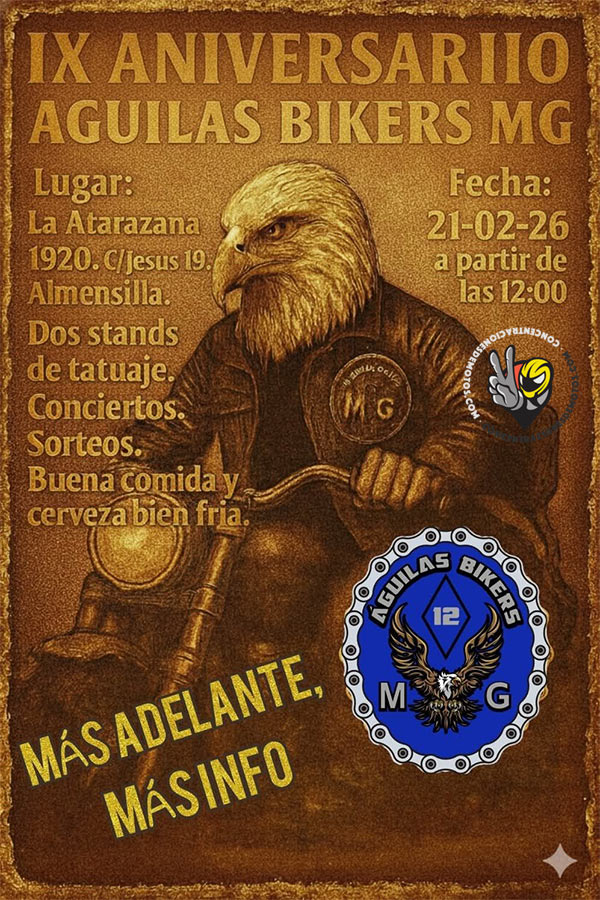 9° Aniversario Águilas Bikers MG Sevilla + Añadir Google Calendar + exportación iCal / Outlook 00 días 00 horas 00 minutos 00 segundos Fecha 21 Feb 2026 Hora Todo el día Rótulos Evento Localización Almensilla, Sevilla Categoría Agenda Motera Evento Compartir este evento