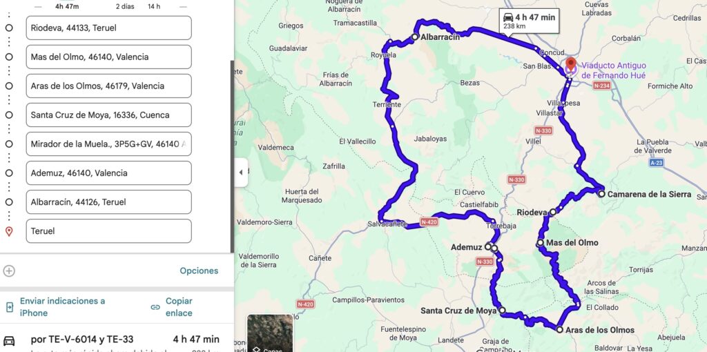 Teruel tiene rápido acceso siguiendo la autovía A-23 que une Zaragoza con Sagunto en la costa valenciana. Para evitar la vía rápida partimos por TE-V- 6014 para comenzar con una serie de carreteras locales que serán la tónica dominante de esta ruta. Camarena de la Sierra es la primera referencia importante. A continuación, la carretera que viaja desde Camarena de la Sierra hasta Riodeva, es de las que emocionan. Asfaltada pero muy estrecha y con grava en mitad de la ruta, cuando no está cortada por nieves, recorre los bosques de las laderas de la sierra de Javalambre a base de continuas curvas. Es de esos tramos que se recuerdan. Evitar hacerla en los meses más crudos del invierno.
