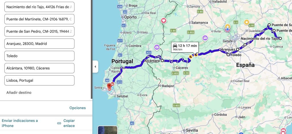 Recomendamos en esta ocasión una ruta larga de casi 1.000 kilómetros para la que hay que dedicar al menos tres días, pues además de su longitud, son muchos los lugares, ciudades y pueblos de interés que se encuentran a los márgenes del río más largo de la península ibérica, el Tajo. Es una ruta que transita por España y Portugal, empezando en la serranía de Cuenca, dentro de la provincia de Teruel, y atraviesa por el centro toda España de este a oeste. El último tramo también atraviesa Portugal a su mitad para finalizar en una grandiosa desembocadura en el océano Atlántico.