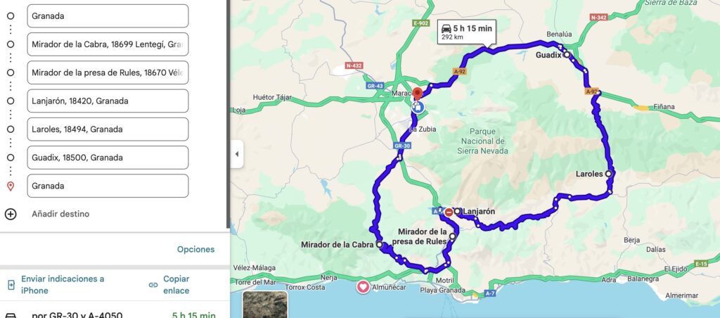 En esta ocasión vamos a recorrer una ruta en dos tramos bien diferenciados; el primero el descenso hasta la costa y el segundo por la Alpujarra granadina. Ambas rutas se pueden hacer independientemente en un solo día con origen y fin en la capital, pero en la que, para los que acudan a la provincia desde otros rincones de España, es muy recomendable dormir en la Alpujarra, pues tiene más que sobrados alicientes para descansar y amanecer en algunos de los inolvidables pueblos alpujarreños.