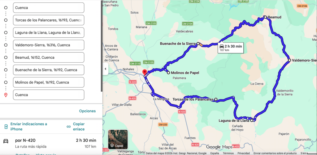 La ruta continúa hasta enlazar, cerca de Laguna de la Cruz —otra parada imprescindible—, con Laguna de la Llana, donde se toma la CUV-9142 dirección norte hacia Valdemoro Sierra y Beamud. Un tramo de carretera de buen asfalto y curvas enlazadas.