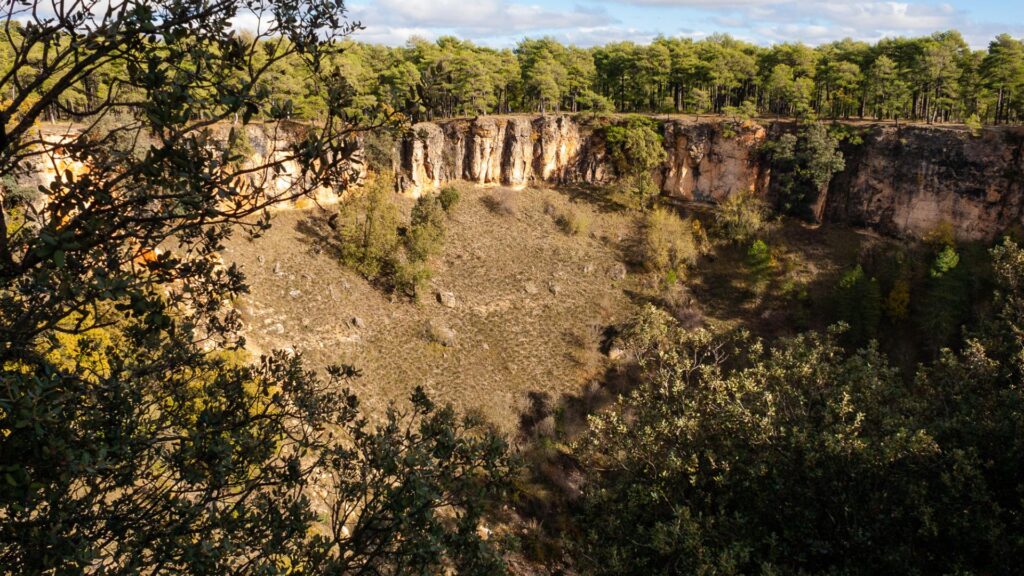 En el descenso se rueda paralelo al río entre una arboleda de ribera que en otoño ofrece colores asombrosos. En el cruce con la CM-2104, toma a la izquierda para seguir por CM-2105 dirección Cuenca y circular por la otra ribera del Júcar. Atravesando la ciudad por la N-320a se deja atrás la urbe y se enlaza con la N-320, la moderna carretera que evita el paso por el centro urbano. A los 12 kilómetros encontrarás un desvío a tu izquierda poco señalizado que indica Torcas. Toma esta ruta para sumergirte en una de las zonas de la sierra conquense menos conocidas. A los márgenes de la ruta quedan primero el Parque Científico Tecnológico de los Palancares y después el albergue campamento, ya dentro de un frondoso bosque de pinos. Entramos en las llamadas Tierras Muertas.